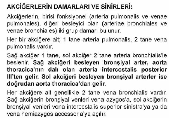 | Sağ Akciğer | 1 tane arteria bronchialis | 3. arteria intercostalis posterior (Aorta thoracica dalı) |
