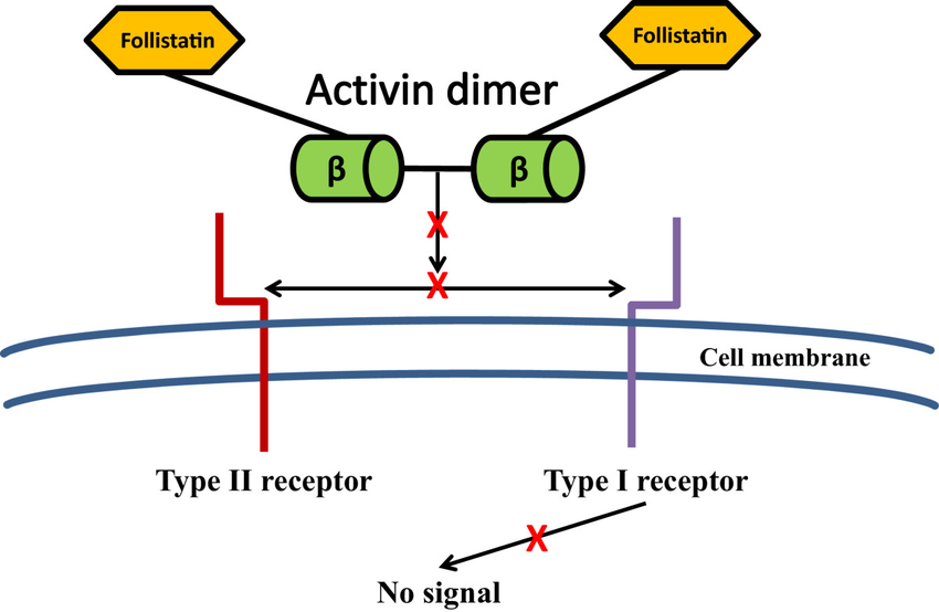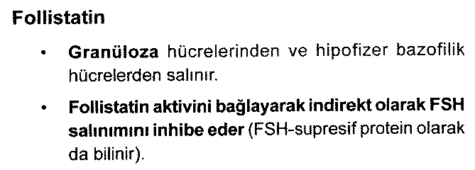 Follistatin; Serbest Activin’i bağlar. Activin’in reseptörüne bağlanmasını engeller. Dolaylı olarak FSH salınımını baskılar.