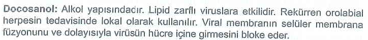 “Docosanol = lipid zarflı virüs + füzyon blokajı + topikal HSV-1.”