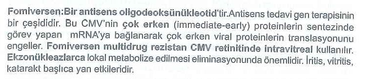 Fomiversen multidrug rezistan CMV retinitinde intravitreal kullanılır. Ekzonükleazlarca lokal metabolize edilmesi eliminasyonunda önemlidir. İritis, vitritis, katarakt başlıca yan etkileridir.
