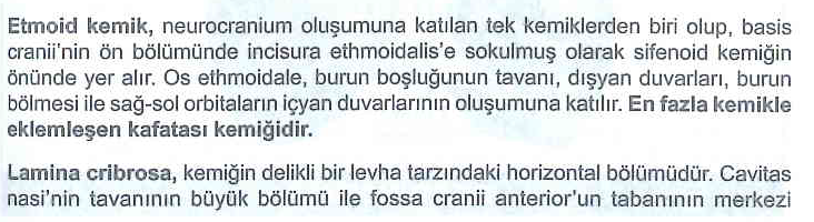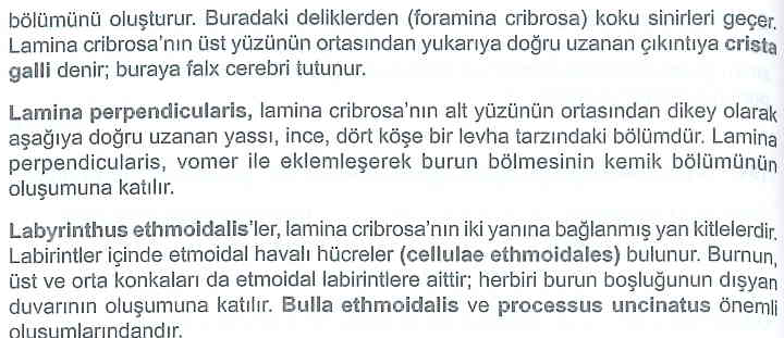 1-Lamina cribrosa (cribriform plate); Ön kafa tabanının bir kısmını oluşturur.Üzerindeki çok sayıdaki delikten olfaktör sinir lifleri (CN I) geçer. Anosmi ve BOS rinore ile ilişkili travma noktasıdır.