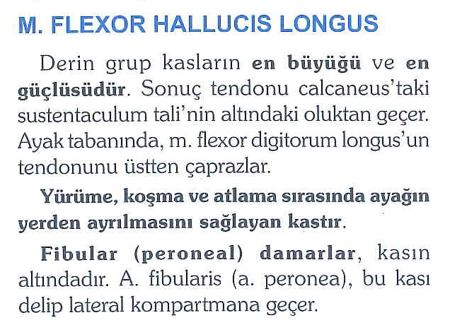 FHL; Derin grubun en büyük & güçlü kasıdır. Sustentaculum tali ALTINDAN geçer. FDL’yi ayak tabanında ÜSTTEN çaprazlar. Push-off kası (yürüme–koşma–atlama) dır. N. tibialis (S2–S3) ile innerve olur. A. fibularis kası deler