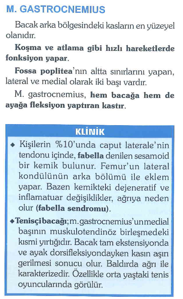 FABELLA; Kişilerin yaklaşık %10’unda bulunur. Caput laterale’nin tendonu içinde bulunan sesamoid kemiktir. Femur lateral kondilinin arka yüzüyle eklem yapabilir. Dejeneratif / inflamatuar değişiklikler Fabella sendromuna neden olabilir. En önemli semptomu, Diz arkasında ağrıdır.