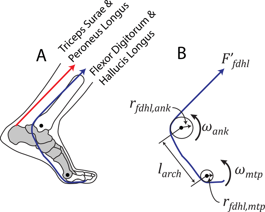 Halluks üzerinden kuvvet aktarımı + medial ark stabilitesi sağlaması ve sonuçta maksimum itişe neden olmasıyla M. flexor hallucis longus (FHL) esas push-off kasıdır.