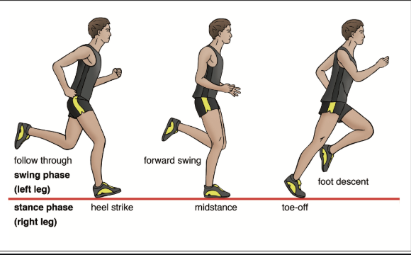 Yürüyüşten Farkları; Stance süresi ↓, Yüklenme kuvveti ↑ (2–3× vücut ağırlığı) ve Topuk teması azalır, ön ayak teması artar.