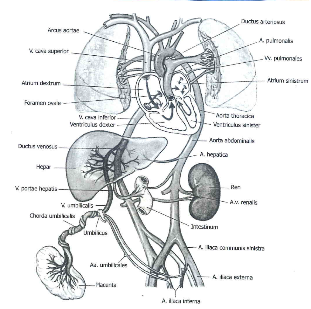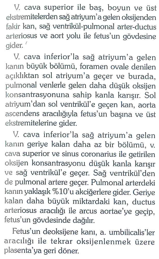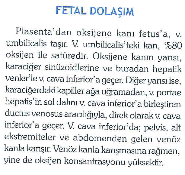 Fetal dolaşımda oksijenli kan v. umbilicalis ile gelir; ductus venosus, foramen ovale ve ductus arteriosus sayesinde karaciğer ve akciğerler büyük ölçüde bypass edilir ve en oksijenli kan beyne yönlendirilir.