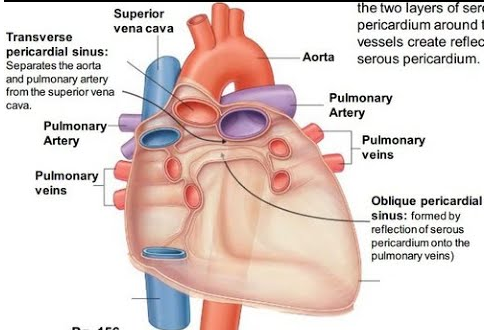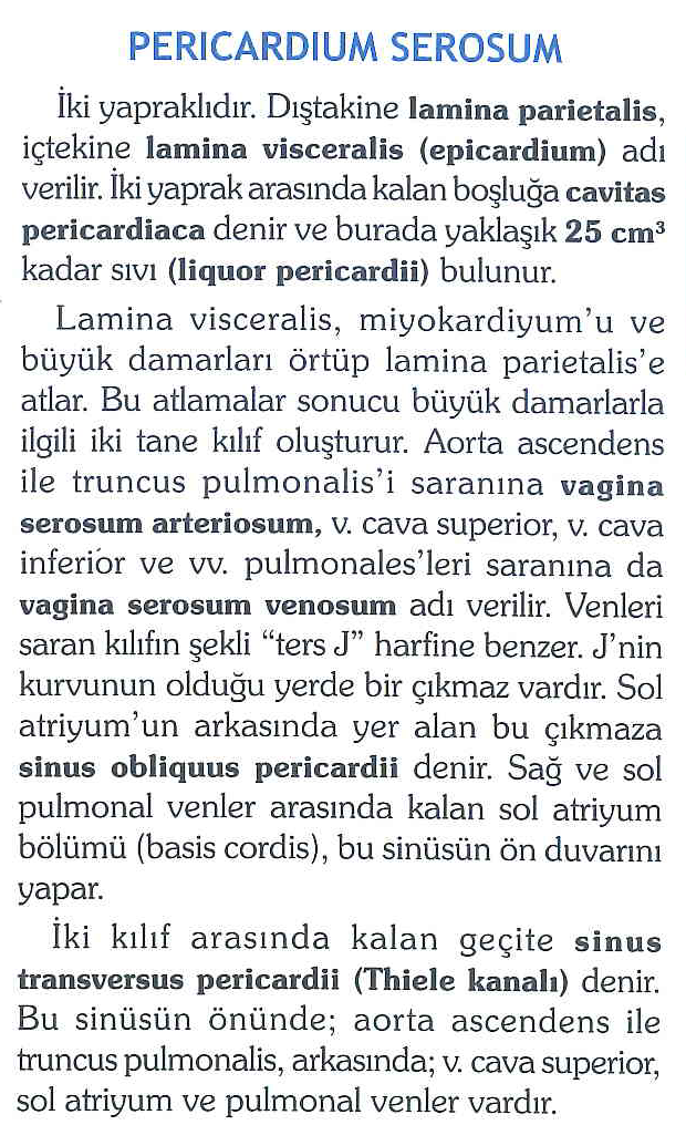 Pericardium serosum iki yapraklıdır; büyük damar yansımalarıyla sinus transversus ve sinus obliquus pericardii oluşur, obliquus çıkmaz, transversus geçittir.