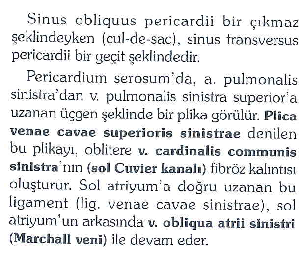 1-Sinus obliquus pericardii; Çıkmaz sokak (cul-de-sac) şeklindedir. Sol atriumun arkasında yer alır ve “Ters J”nin kıvrımında bir planda seyir eder. Ön duvarını Sağ ve sol pulmonal venler arasındaki sol atrium bölümü (basis cordis) yapar. Obliquus; arka, çıkmaz anlamında kullanılır.