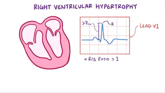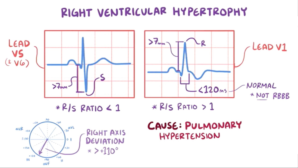 Sağ ventrikül hipertrofisi: Standart derivasyonlarda sağ aks deviasyonu (dal bloğu yokken), V1de R/S>1 veya V5’de R/S<1 olması