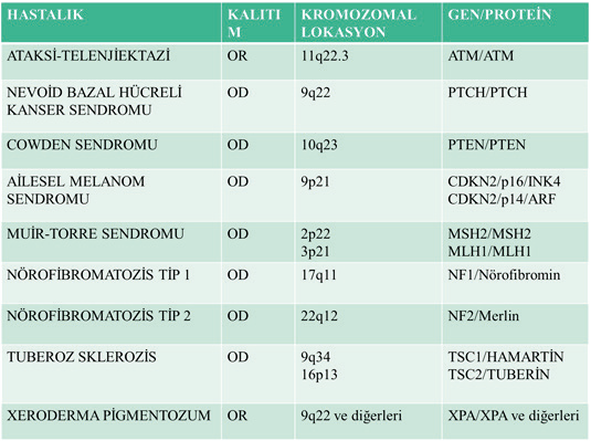 | Ataksi-Telenjiektazi | OR | 11q22–23 | ATM | Çift iplik DNA kırığı onarımı (DSB) | Serebellar ataksi, telenjiektazi, ↑ AFP, lenfoma |