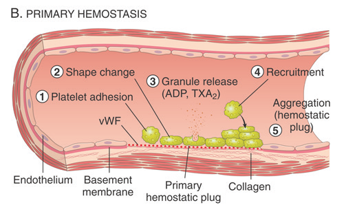 Primer hemostaz trombosit tıkacı oluşmasıdır. Trombositlerde degranülizasyonun temel nedeni şekil değişikliğidir. Primer hemostaz; trombosit tıkacı oluşmasıdır. Endotel hasarı ile von Willebrand Faktör (vWF) ve kollajen açığa çıkar. Bu faktörler trombosit adezyonunu ve aktivasyonunu uyarır. Trombosit aktivasyonu şekil değişikliğine yol açarak degranülizasyona (TXA2, ADP) neden olur.