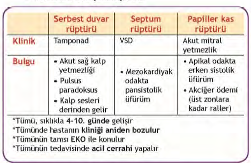 | Patoloji | LV serbest duvar yırtılır | İnterventriküler septum yırtılır | Papiller kas (özellikle posteromedial) yırtılır |