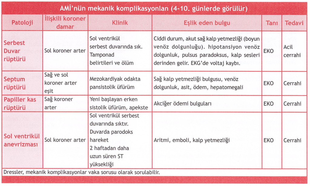 Dressler Sendromu notu ise önemlidir: Bu, MI’dan haftalar sonra gelişen, otoimmün kaynaklı bir perikardittir (mekanik değil, inflamatuar bir komplikasyondur).