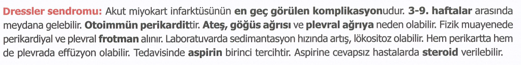 Sınav sorularında MI üzerinden bir ay geçmiş bir hastada “ateş ve nefesle artan göğüs ağrısı” tarif ediliyorsa, akla ilk gelmesi gereken tanı Dressler Sendromu’dur.