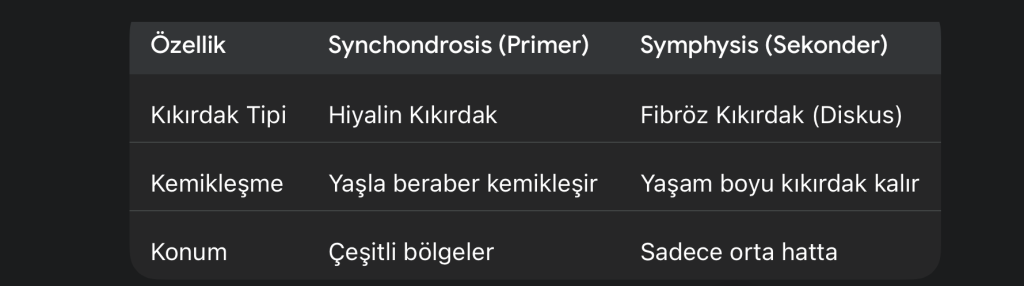 • Temel Özelliği: Zamanla, yani yaş ilerledikçe bu kıkırdak doku kemikleşir (synostosis haline gelir).