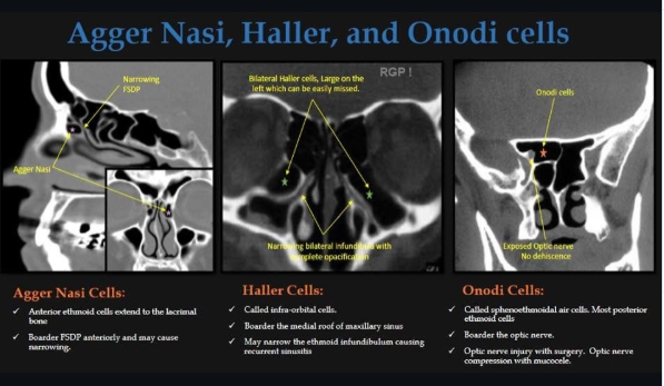 Agger Nasi Hücresi: İlk etmoid hava hücresi ve frontal girintinin anahtarı. Büyükse frontal sinüs drenaj yolu tıkanıklığını düşünün. FSDP (Frontal Sinus Drill-out Procedure)***. Agger nasi hava hücreleri, frontal girintinin anterolateral ve inferiorunda ve orta türbinatın yapışma yerinin önünde ve üstünde yer alan en ön etmoidal hava hücreleridir . Gözyaşı kemiği içinde yer alırlar ve bu nedenle orbita , gözyaşı kesesi ve nazal lakrimal kanal ile lateral ilişkileri vardır. Agger nasi hücreleri etmoidal bullaların önünde yer alır ve nazofrotal girintiyi daraltarak frontal sinüs hastalığına neden olabilir. Bu hücreler hastaların %90’ında tespit edilir ve Haller hücreleri (orbitanın medial tabanında yer alır) veya supraorbital hava hücreleri (orbitanın tavanında yer alır) ile karıştırılmamalıdır. Bunlar kronik frontal sinüzite katkıda bulunabilir.