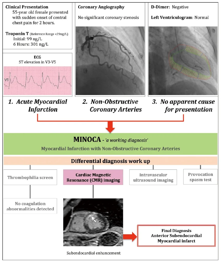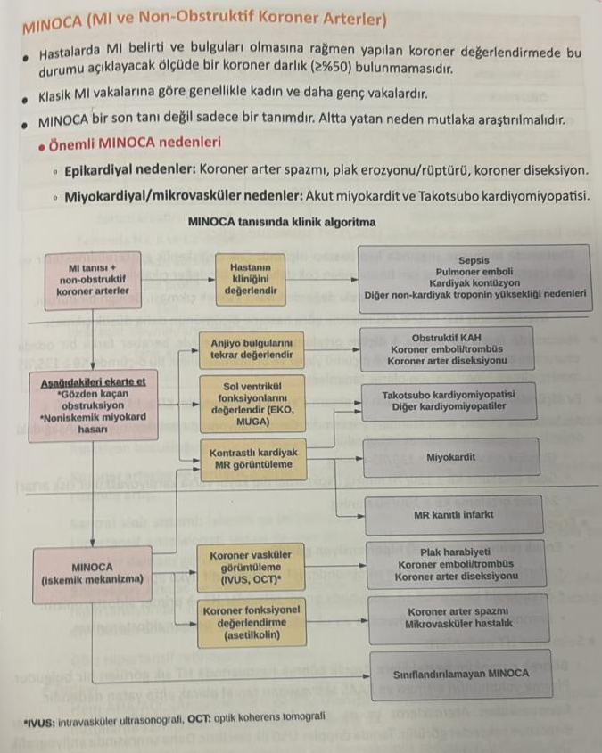 MINOCA, klasik MI kriterleri olmasına rağmen koroner anjiyografide anlamlı obstrüksiyon (<%50 stenoz) olmaması durumudur.***********************