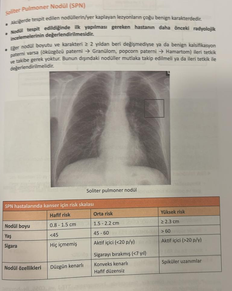 Soliter pulmoner nodül (SPN): Çevresinde atelektazi, lenfadenopati, plevral efüzyon bulunmaması koşullarında Akciğerde ≤3 cm, tek, yuvarlak opasite varlığı durumudur.