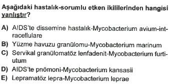 | Servikal lenfadenit | Mycobacterium scrofulaceum | Çocuklarda ağrısız boyun şişliği (skrofula) yapar. M. fortuitum ise genelde deri/yumuşak doku enfeksiyonu yapar. |