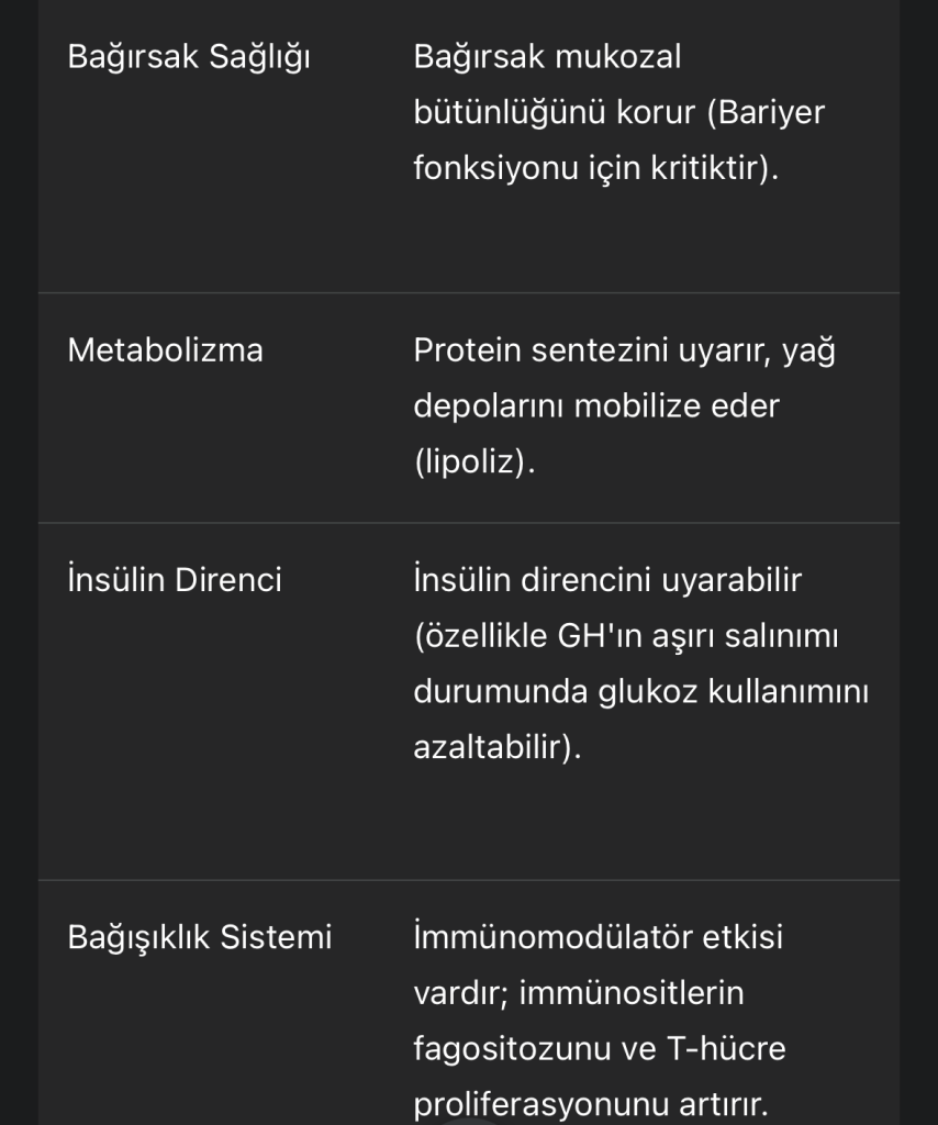 Bu notta vurgulanan “bağırsak mukoza bütünlüğünü koruma” ve “fagositik fonksiyonu uyarma” özellikleri, cerrahi stres veya sepsis gibi katabolik durumlarda IGF-1’in neden kritik bir öneme sahip olduğunu açıklar. Özellikle cerrahi branşlarda post-op iyileşme süreci için bu anabolik yolakların sağlıklı işlemesi beklenir.