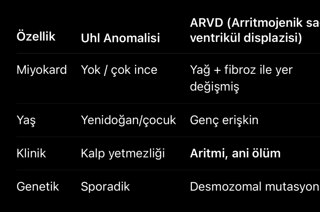 · Karıştırıldığı Durum: Arritmojenik Sağ Ventriküler Displazi (ARVD) ile sıklıkla karıştırılır. Her ikisi de sağ ventrikülü etkiler ancak Uhl anomalisi doğuştan itibaren miyokardın tamamen yokluğu ile karakterliyken, ARVD genellikle erişkin yaşlarda ortaya çıkan ve miyokardın yağlı/ fibröz doku ile yer değiştirmesi (ilerleyici) şeklindedir.