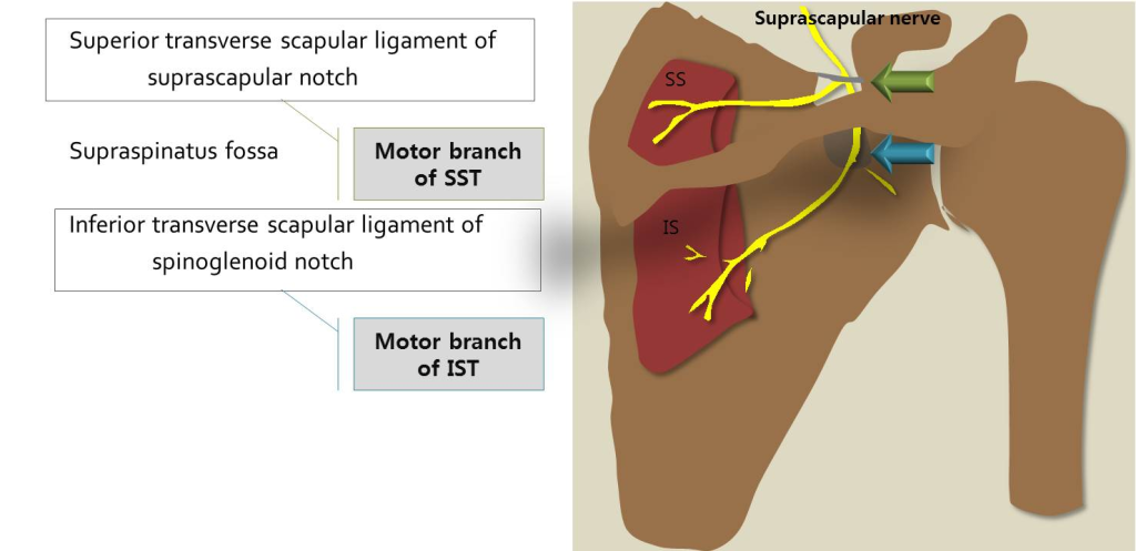 Anatomi: C5–C6 n. suprascapulareyi oluşturur. Bu sinir seyirinde Lig. transversum scapulae superius altından geçer. Arter, ligament üstünden geçer (Army over, Navy under) ****