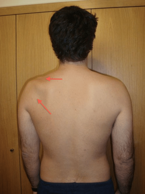b-Kas atrofisi: Supraspinatus fossası çökük, İnfraspinatus fossası çökük