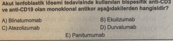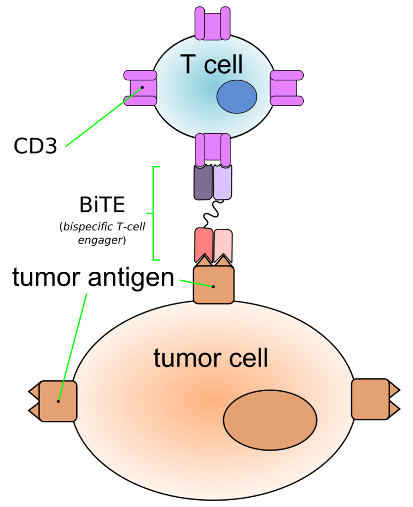 Seçici olarak etki eden ve insan bağışıklık sistemini tümör hücrelerine karşı harekete yönlendiren , bi-spesifik T-hücre bağlayıcıları (BiTE’ler) olarak adlandırılan, oluşturulmuş monoklonal antikorlar sınıfına aittir . Blinatumomab, B hücrelerinde bulunan CD19 antijenini spesifik olarak hedefleyen bi-spesifik bir CD19-yönlendirilmiş CD3 T-hücre bağlayıcısıdır.