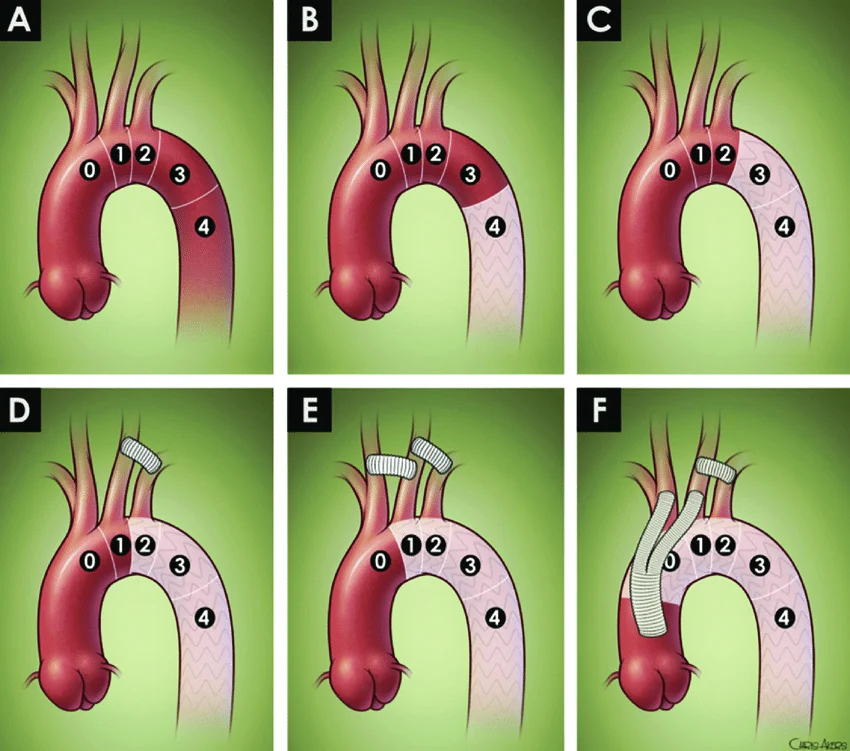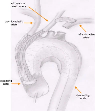 - Cerrahi: Asendan aortaya yan klemp konulur ve bir “trifurke greft” ile supra-aortik dallar (innominat, sol karotis, sol subklavyen) yeniden ağızlaştırılır.