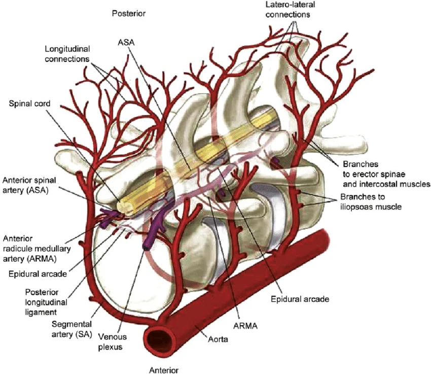 Spinal kordun anterior 2/3’lük kısmını besleyen tek bir Anterior Spinal Arter (ASA) vardır. Ancak bu arter, aortadan gelen segmental arterler (interkostal ve lomber arterler) tarafından beslenir.