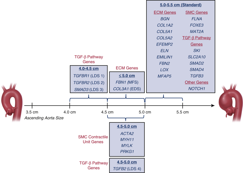 Loeys-Dietz syndrome lu hastalarda Çok erken rüptür/diseksiyon riski nedeni ile Cerrahi eşik; 4.0–4.5 cm