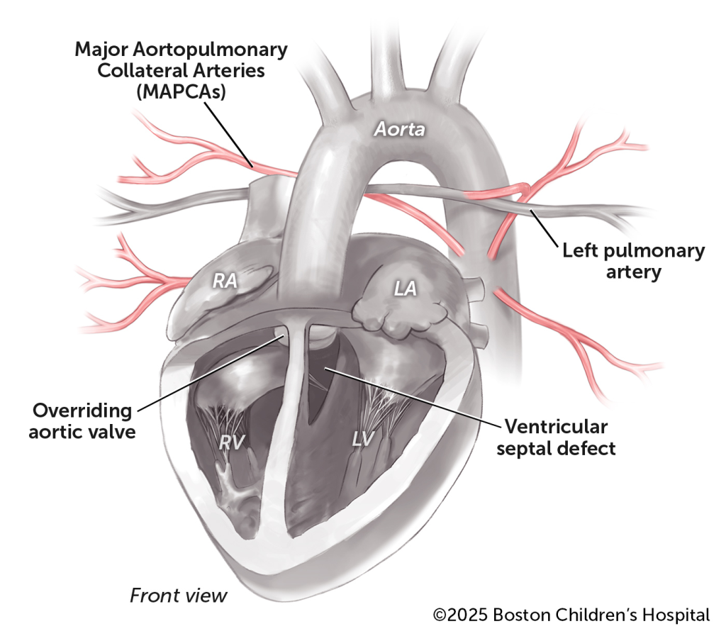 MAPCA’lar muhtemelen splanknik damarlardan kaynaklanır. Genellikle küçük bir merkezi birleşme noktası mevcuttur ve MAPCA’ların çoğu proksimal inen torasik aorttan kaynaklanır. VSD tipik olarak anteriora doğru yanlış hizalanmıştır. Defekt, VATER, Alagille, DiGeorge ve trizomi 21 sendromları ile ilişkilidir.