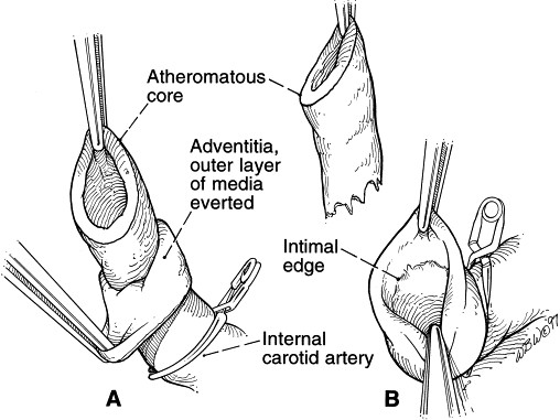 Eversiyon TEA’nın en önemli adımı, büyüteç ve mikrocerrahi teknik kullanılarak, dokunun sağ katmanındaki plak silindirinin tamamının çıkarılmasıdır. Karotis duvarı, tıpkı kıvrılmış bir gömlek kolu gibi, silindirin üzerine doğru ters çevrilir ve aşağı çekilir . Sağlıklı doku tabakası plaktan ayrılır ve kalan kısımlar dikkatlice çıkarılır. Daha sonra, ortak ve dış karotis arterleri de kalıntılardan temizlenir.