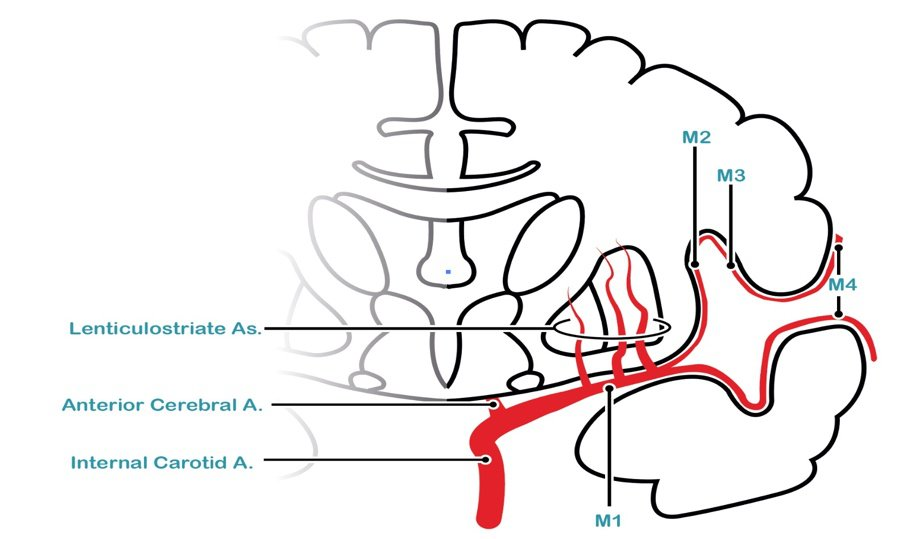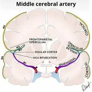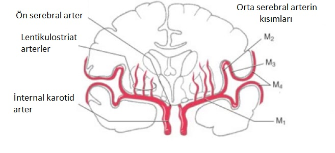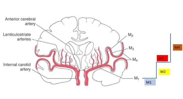 Orta Serebral Arter (MCA), Willis poligonundan köken alan en büyük ve klinik olarak en önemli serebral arterdir. Anatomik seyri boyunca, proksimalden distale doğru M1’den M4’e kadar dört ana segmente ayrılır.