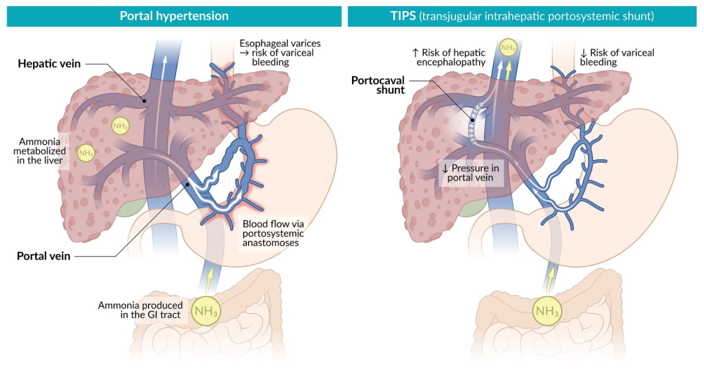 TIPS sonrası ensefalopati artar. Ama Varis kanaması ve asit azalır. En uygun hasta, İyi karaciğer rezervi (Child A–B) olan vakalardır. Refrakter portal hipertansiyon komplikasyonudur.