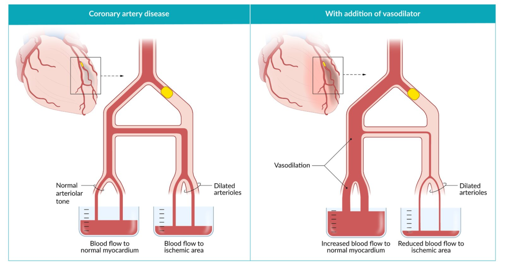 Dipiridamol Etkisi: Dipiridamol (veya adenozin gibi ajanlar), koroner arterlerdeki düz kasları gevşeterek vazodilatasyona neden olur. Ancak bu genişleme, sadece sağlıklı (vazodilatör rezervi olan) damarlarda gerçekleşir.