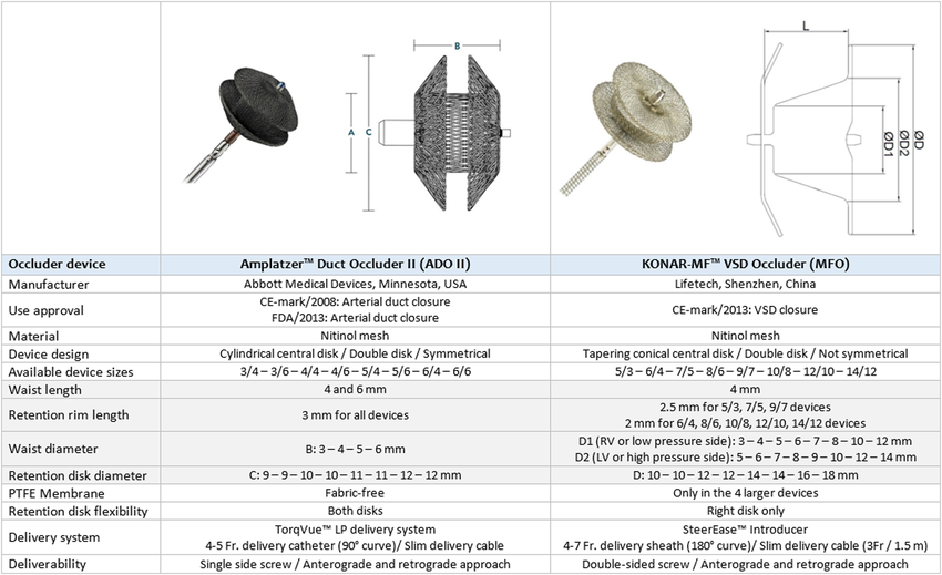 Birçok cihaz mevcuttur, ancak son yıllarda Konar-MF VSD tıkayıcı (MFO; Lifetech Scientific, Shenzhen, Çin) ve Amplatzer Duct Occluder II (ADO II; Abbott, Chicago, Illinois, ABD) en sık bildirilenler olmuştur.