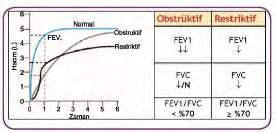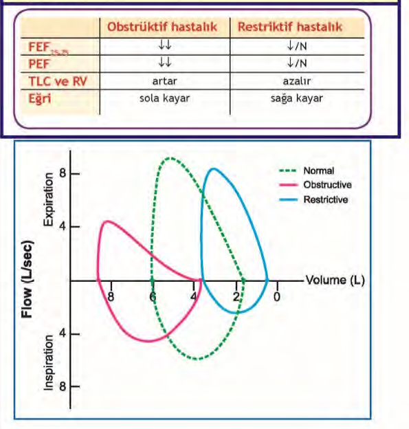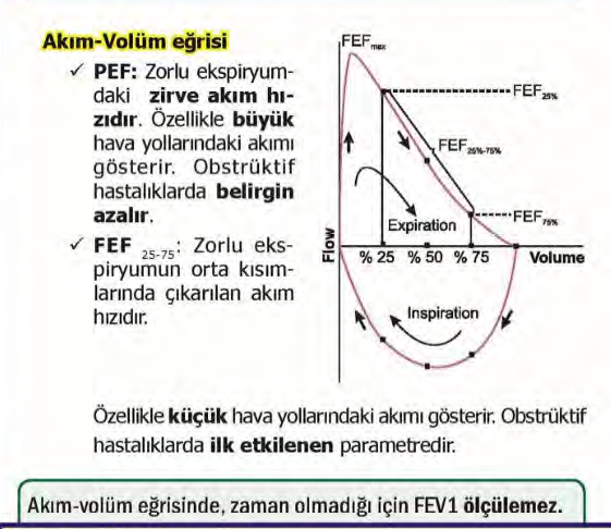 ***************FEF25–75 (TUS’ta çok sorulur); Küçük hava yollarını gösterir. Obstrüksiyonda İLK bozulan parametredir ve Astımın erken tanısında önemlidir.