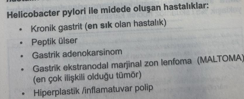 2-Peptik ülser; Duodenum ülseri (en sık), Gastrik ülser oluşumuna katılır.. Mekanizma; Üreaz üzerinden amonyak üretimi sonucunda Mukozal bariyer bozulur. Asit etkisi artar.