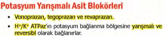 Etki Mekanizması; Proton pompasının K⁺ bağlanma bölgesine yarışmalı (kompetitif) reversibl (geri dönüşümlü) bağlanırlar