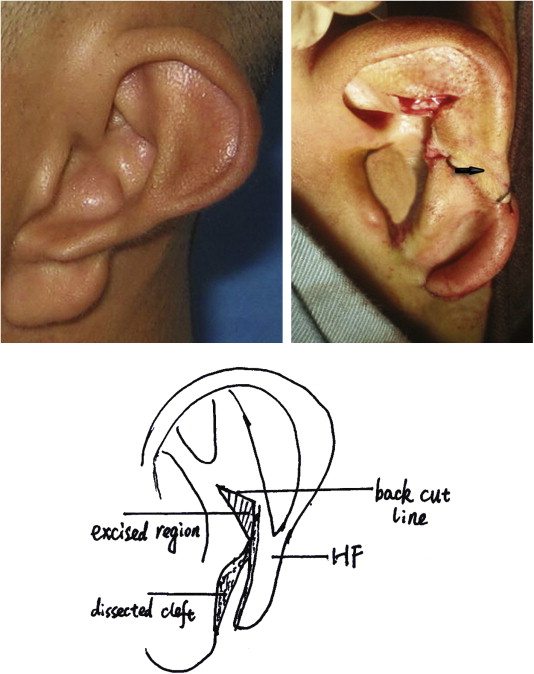 Bu deformite için çift karşılıklı Z-plasti ile Y-V flebi kombinasyonunu içeren yeni bir teknik kullandık. Klinik çalışmamızda, deformitenin rekonstrüksiyonu için bu tekniğin kullanılmasının, yalnızca yerel dokuları kullanarak heliks kenarı ve kıvrım konturu açısından mükemmel sonuçlar verdiğini göstermektedir.