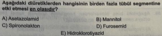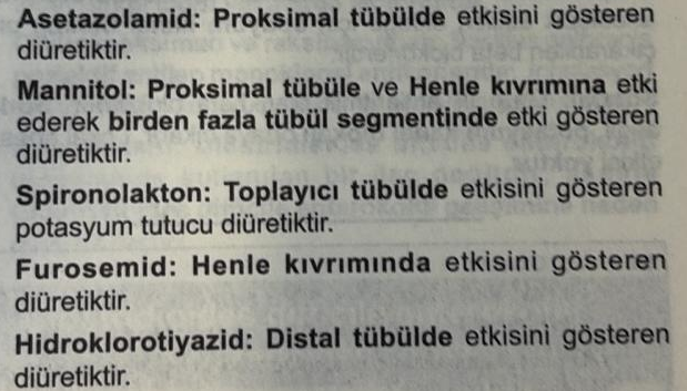 | Furosemid | Çıkan Kalın Kol (Henle) | Na-K-2Cl İnhibisyonu |